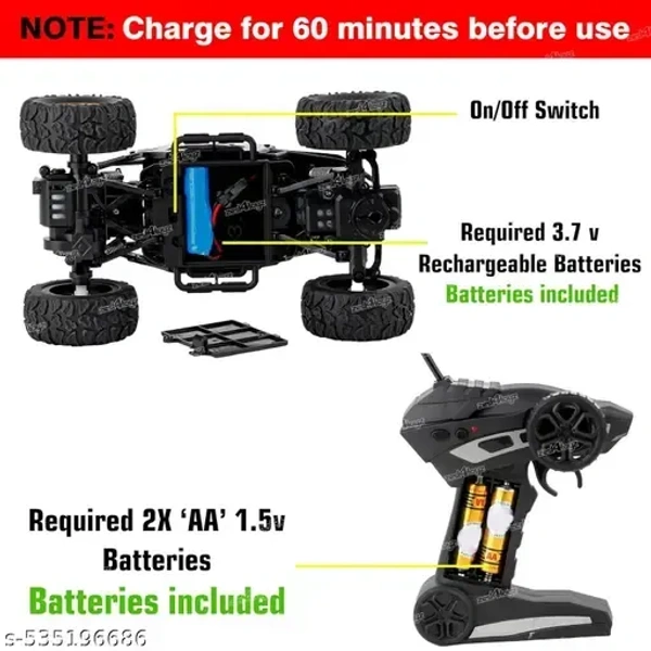 3.6 V Rechargeable Battery (Included) and the Remote Controller - 2 x AA Batteries (Not Included). Note - Remote controlled Car needs to be charge before use for at least 60 minutes.
